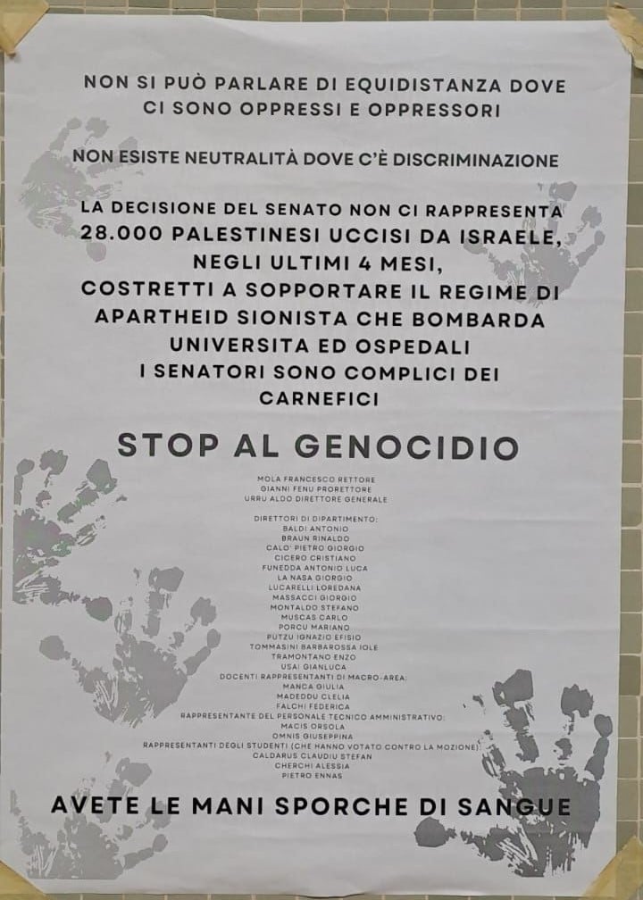 Il riferimento alla mozione presentata da un gruppo di studenti che chiedeva la rottura dei rapporti tra l’Università di Cagliari e le Università israeliane, ma il Senato accademico ha ritenuto, con voto unanime, tranne per quello di uno rappresentante studentesco, di bocciarla.