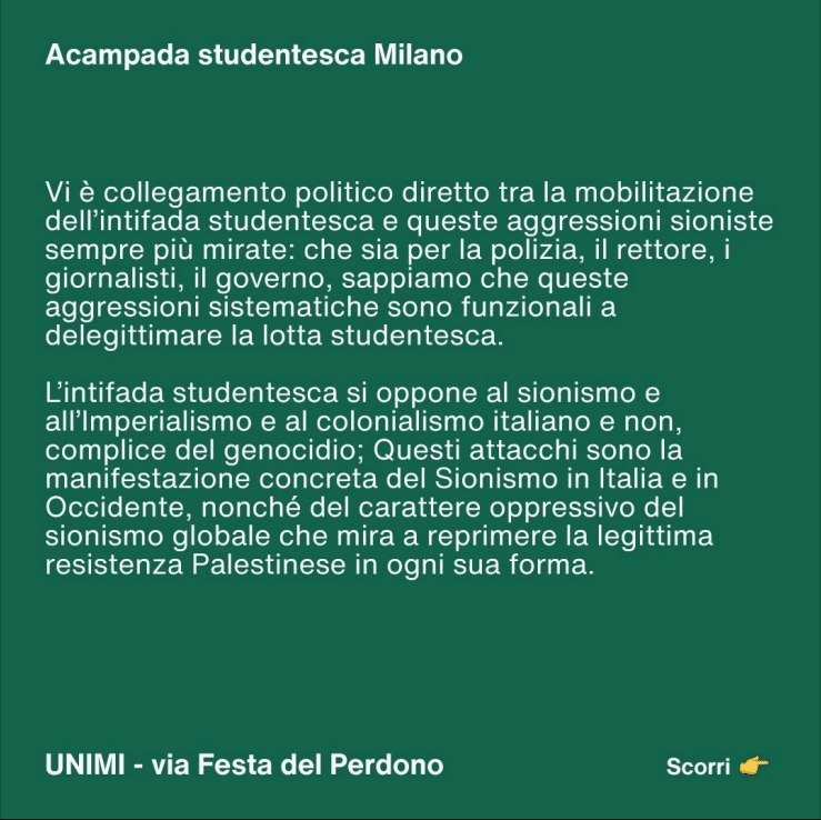Gli studenti dell’Acampada scrivono sui loro social che hanno occupato l’Università Statale per globalizzare la causa di Hamas – ovvero la liberazione della Palestina che definiscono “resistenza”. La rissa scoppiata tra studenti pro Pal e Lotta comunista viene fatta passare per un’aggressione sionista. Nel loro post sui social denunciano “il rettore, la polizia, i giornalisti e il governo”, anziché i loro compagni di Lotta comunista.