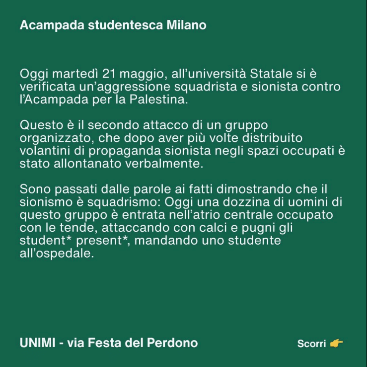 “È la seconda volta che i due gruppi vengono alle mani. La settimana scorsa, alcuni studenti pro Palestina avevano discusso con coetanei che vendevano il giornale di Lotta Comunista e la vicenda era finita a schiaffi e spintoni. Ieri mattina, una dozzina di attivisti del movimento si è azzuffata con gli studenti accampati. «Uno dei nostri compagni è finito all’ospedale», denunciano. Il motivo del contendere, secondo quanto ricostruito dalla Questura, è prettamente politico, con Lotta Comunista che, da una parte, sostiene il coinvolgimento anche della sinistra israeliana nella questione palestinese e gli studenti accampati che di questo non vogliono sentire parlare, tanto da dare dei «sionisti» e degli «squadristi» agli altri. «Sappiamo che queste aggressioni sistematiche sono funzionali a delegittimare la lotta studentesca. L’intifada studentesca si oppone al sionismo e all’imperialismo e al colonialismo italiano e non, complice del genocidio… Siamo consapevoli del fatto che ogni attacco subito verrà strumentalizzato per proseguire con la crescente militarizzazione e censura negli atenei», recita una nota degli occupanti […]”.