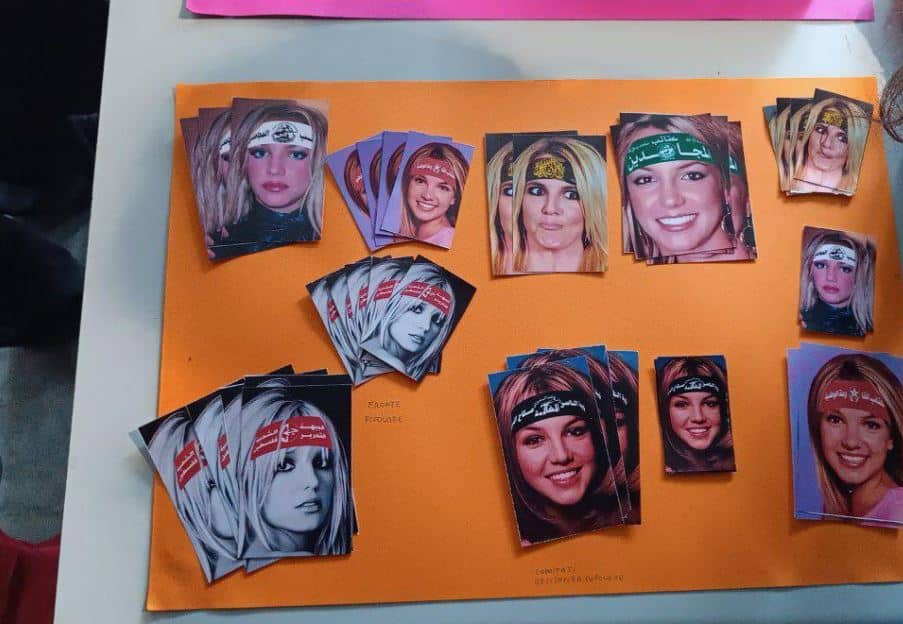 Ad esempio, è presente il triangolo rosso di Hamas che rimanda al mirino dei miliziani che colpiscono gli israeliani, adesivi dove è presente Abu Obeida (portavoce di Hamas) e adesivi dove le modelle internazionali hanno la fascia tipica dei terroristi palestinesi (abbigliamento tipico delle brigate di Al-Qassam).