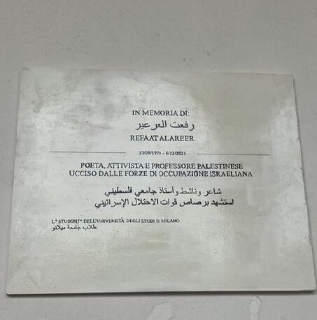 Targa dedicata al militante di Hamas Refaat Alareer nel cortile dell’Università Statale