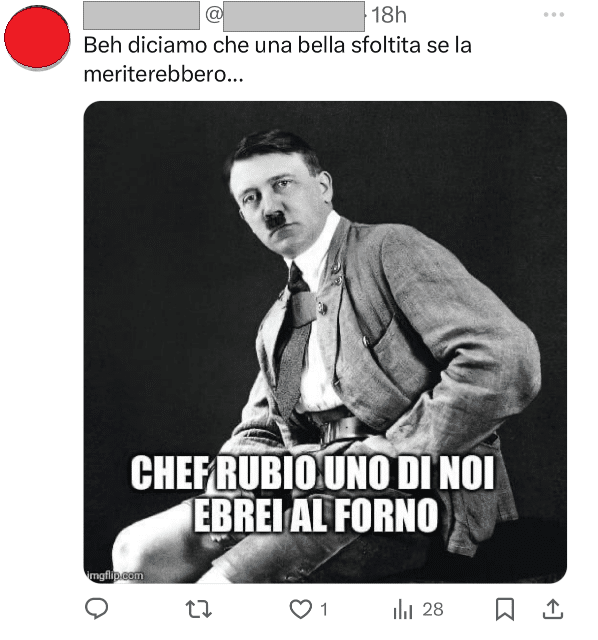 Stampa 28 Settembre 2024 X, “ebrei al forno” Luogo: Twitter/X Fonte: Segnalazione CE “Beh diciamo che una bella sfoltita se la meriterebbero…” Utente X pubblica meme di supporto a Chef Rubio e aggiunge la scritta “ebrei al forno”.