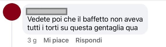 Stampa 8 Maggio 2024 Facebook, utente commenta con contenuti illegali Luogo: Facebook Fonte: Segnalazione “Vedete che poi il baffetto non aveva tutti i torti su questa gentaglia qua” Nei commenti poi continua, insultando una persona che gli ha risposto scrivendo “Ve la siete meritata tutta, ANIMALI”.