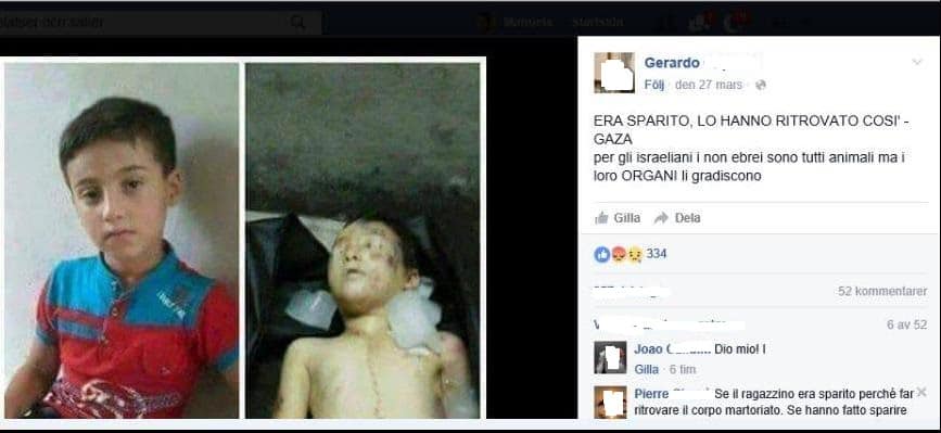 Nel suo commento Gerardo C. cita una falsa citazione talmudica tratta da un noto testo di polemistica antisemita: «Era sparito, lo hanno ritrovato così – Gaza, per gli israeliani i non ebrei sono tutti animali ma i loro organi li gradiscono».