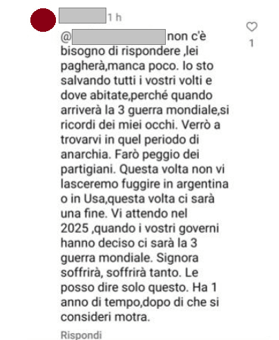 Un uomo risponde ad una signora ebrea su Instagram facendo riferimenti antisemiti, con l’accusa che il suo governo scatenerà la terza guerra mondiale, e minaccia: “soffrirà, soffrirà tanto. […] Ha un anno di tempo, dopo di che si considera morta”.