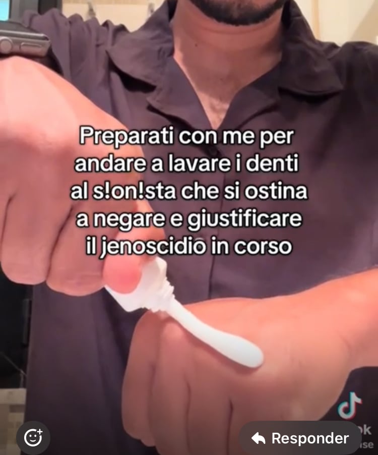 Utente pubblica un video su TikTok in cui mette dentifricio sul pugno con la scritta: “preparati con me per andare a lavare i denti al sionista che si ostina a negare e giustificare il jenoscidio [genocidio] in corso”