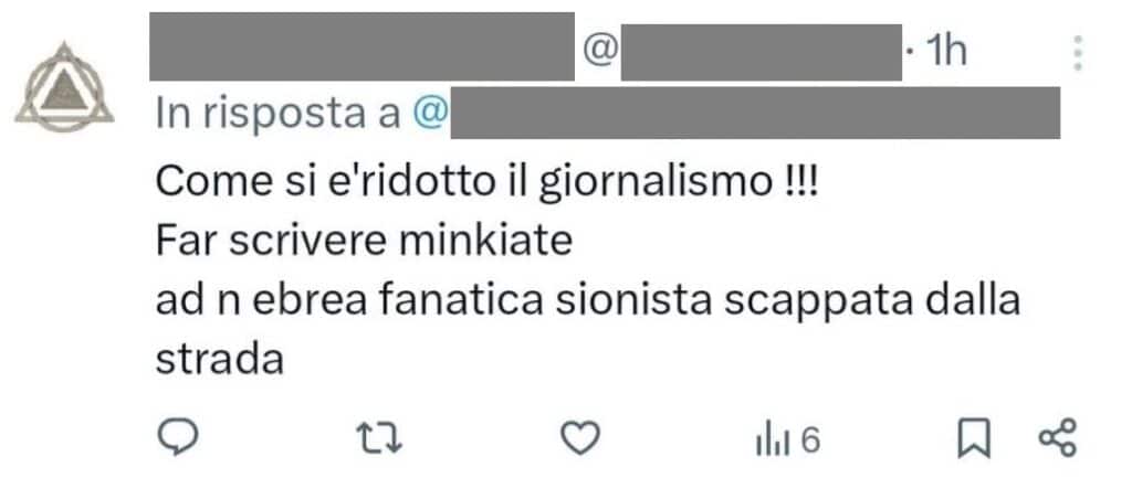 Stampa 30 Settembre 2024 X, utenti insultano una giornalista Luogo: X/Twitter Fonte: Segnalazione “ebrea fanatica sionista scappata dalla strada” Giornalista presa di mira dalla fanbase di un noto influencer che su X diffonde contenuti antisemiti e cospirativisti.