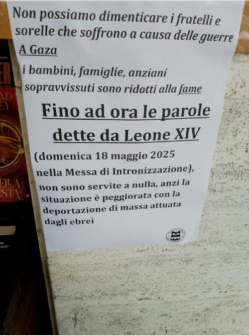 Viareggio, affisso un cartello con contenuti antisemiti, che attribuisce in maniera diretta e indiscriminata la responsabilità agli ebrei, estendendo accuse e generalizzazioni. Il messaggio non solo banalizza e distorce la complessità della situazione geopolitica, ma lo fa ricorrendo a stereotipi e pregiudizi di matrice antisemita. Sono inoltre presenti richiami di carattere religioso che rafforzano ulteriormente il tono discriminatorio e offensivo. Ecco il testo completo: «Non possiamo dimenticare i fratelli e sorelle che soffrono a causa delle guerre A Gaza i bambini, famiglie, anziani sopravvissuti sono ridotti alla fame Fino ad ora le parole dette da Leone XIV (domenica 18 maggio 2025 nella Messa di Intronizzazione) non sono servite a nulla, anzi la situazione è peggiorata con la deportazione di massa attuata dagli ebrei».