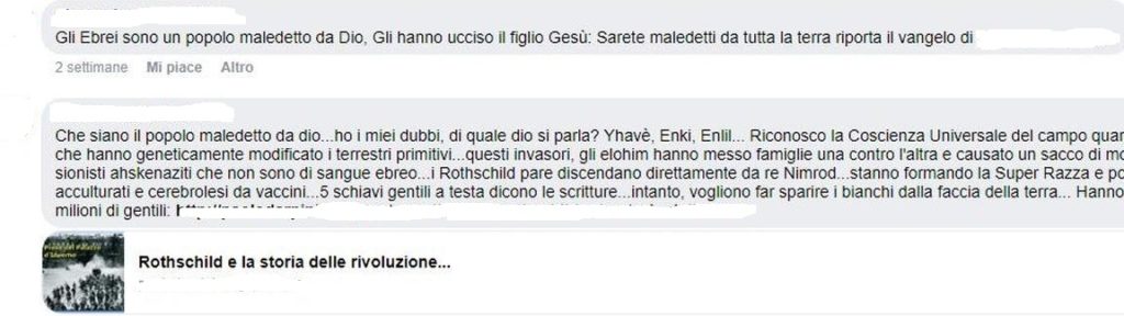 Pagina Facebook di estrema destra con circa 15mila followers pubblica un video denigratorio nei confronti degli ebrei, seguono decine di commenti con contenuti antisemiti postati da simpatizzanti della destra radicale e delle teorie complottiste molto attivi nei social di area. Segue una breve antologia di post: