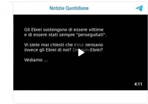 Canale radio-video su Telegram posta un filmato che accusa gli ebrei di essere crudeli, sanguinari e razzisti, a supporto delle accuse vengono citati falsi passi del Talmud.