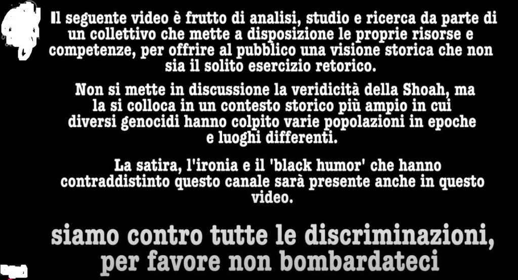 Video di matrice complottista ed antisemita che, prendendo spunto dalla Shoah («La religione dell’Olocausto l’unica vera grande religione rimasta in Occidente»), impiega i principali temi della polemistica antisemita. Secondo il curatore di “LA RELIGIONE OLOCAUSTICA – come USA e Sionisti usano la Shoah per tenere asservita l’Europa” la Shoah sarebbe uno strumento usato da americani e sionisti per tenere sotto ricatto il mondo.