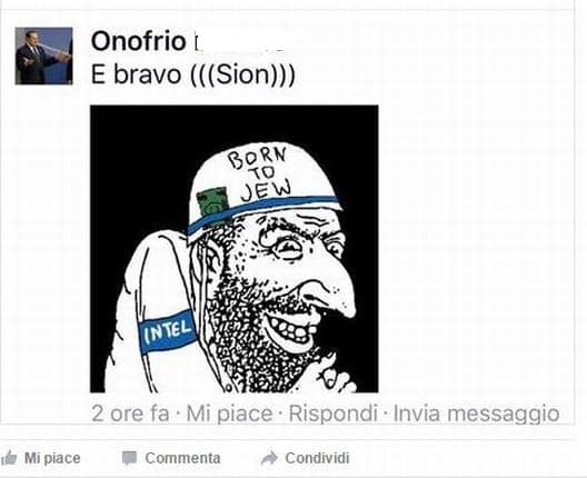 L’utente Onofrio B. ha pubblicato sulla bacheca Facebook di Emanuele Fiano, deputato PD e noto esponente della Comunità Ebraica Italiana, una vignetta antisemita con la scritta «E bravo (((Sion)))».