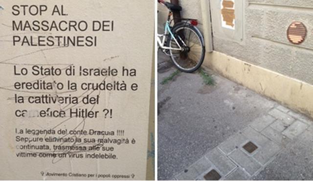 «Stop al massacro dei palestinesi – si legge nel volantino – Lo Stato di Israele ha ereditato la crudeltà e la cattiveria del carnefice Hitler?! La leggenda del conte Dracula!!!! Seppure eliminato la sua malvagità continuata trasmessa alle sue vittime come un virus indelebile».