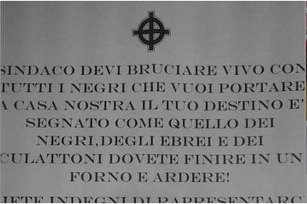 «Sindaco devi bruciare vivo come tutti i negri che vuoi portare a casa nostra il tuo destino è segnato come quello dei negri, degli ebrei e dei culattoni dovete finire in un forno e ardere! Siete indegni di rappresentarci, voi che volete mescolare la nostra razza con razze inferiori. Voi e i comunisti siete la rovina del nostro Paese. Vergogna. Non sei degno di esistere. Ti aspetteremo sotto casa. Viva il Duce». Il messaggio è stato ricevuto dal sindaco di Pontebba Ivano Buzzi, reo di aver dichiarato la disponibilità del suo Comune ad ospitare una trentina di profughi.