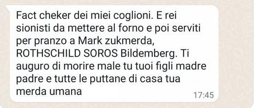 Stampa 4 Luglio 2022 Whatsapp: minacce di morte a un giornalista Fonte: Segnalazione «ti auguro di morire male» Giornalista specializzato nello smascheramento di false notizie complottiste viene minacciato via Whatsapp.