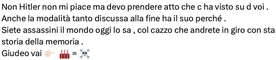 Stampa 7 Gennaio 2024 X, commento antisemita Fonte: Segnalazione CE «Hitler c’ha visto su di voi» Utente X posta un commento antisemita che accusa gli ebrei di essere “assassini” e che «Hitler c’ha visto su di voi».