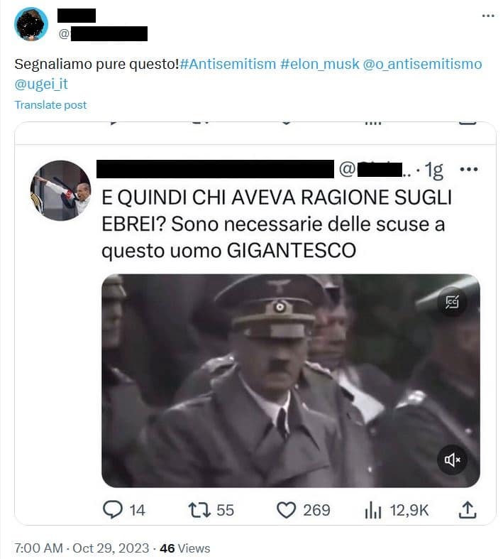 Utente X/Twitter posta un commento corredato da una fotografia di Hitler dove sostiene che Hitler (“uomo gigantesco”) aveva ragione ad uccidere gli ebrei. Il post neonazista è motivato dagli eventi in terra di Israele.