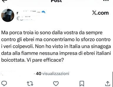 Utente X posta il seguente messaggio minaccioso: «Ma porca troia io sono dalla vostra da sempre contro gli ebrei ma concentriamo lo sforzo contro i veri colpevoli. Non ho visto in Italia una sinagoga data alle fiamme nessuna impresa di ebrei italiani boicottata. Vi pare efficace?».