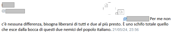 “Per me non c’è nessuna differenza, bisogna liberarsi di tutti e due (Segre e Mattarella) al più presto. È uno schifo totale quello che esce dalla bocca di questi due nemici del popolo italiano”.