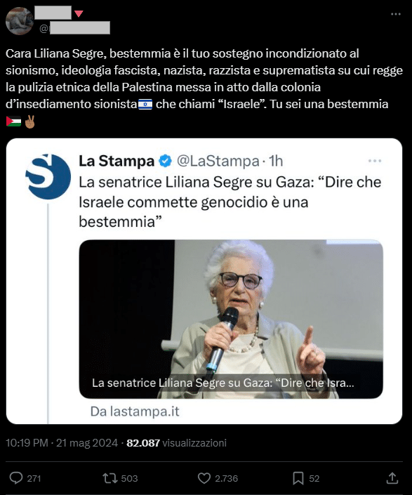 “Cara Liliana Segre, bestemmia è il tuo sostegno incondizionato al sionismo, ideologia fascista, nazista, razzista e suprematista su cui regge la pulizia etnica della Palestina messa in atto dalla colonia d’insediamento sionista che chiami “Israele”. Tu sei una bestemmia”.