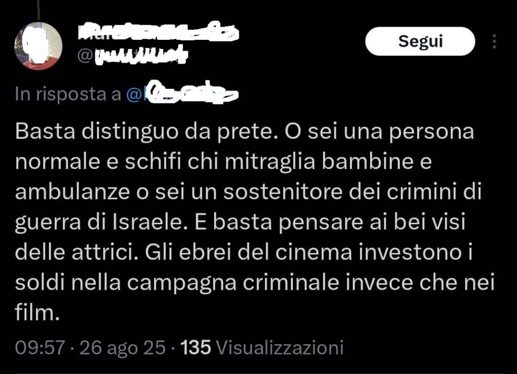 Dirigente di un partito socialista milanese, in merito alla campagna di odio promossa dal movimento pro pal contro l’attrice israeliana Gal Gadot in occasione del festival cinematografico di Venezia, rispondendo su X ad un noto giornalista pro pal scrive: «Basta distinguo da prete. O sei una persona normale e schifi chi mitraglia bambine e ambulanze o sei un sostenitore dei crimini di guerra di Israele. E basta pensare ai bei visi delle attrici. Gli ebrei del cinema investono i soldi nella campagna criminale invece che nei film.»