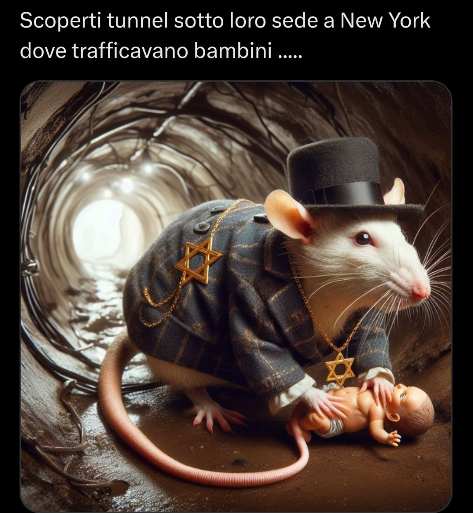 Stampa 9 Gennaio 2024 X, post antisemita Fonte: Segnalazione “gli ebrei trafficano coi bambini” Utente X pubblica un post antisemita che trae spunto da una falsa notizia che accusa alcuni ebrei Usa di violenze a bambini non ebrei.