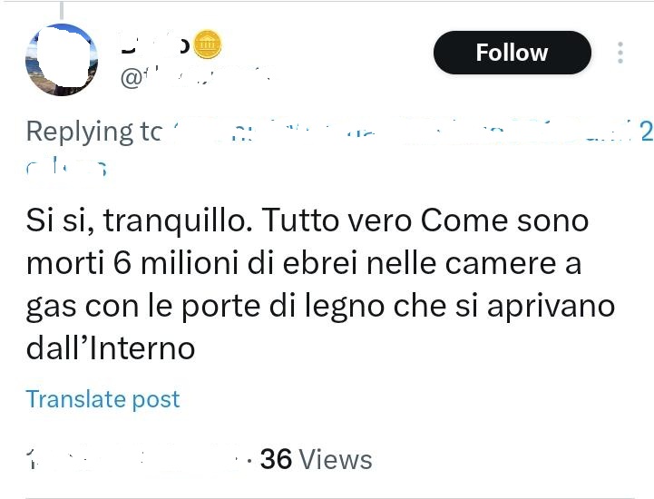 Stampa 28 Marzo 2025 X, post antisemiti Fonte: Segnalazione «mer… ebree» Utente X posta e condivide messaggi contro gli ebrei.