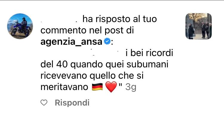 Stampa 8 Marzo 2024 X/Twitter, commenti antisemiti Fonte: Segnalazione «Peccato che non c’è Hitler» Utenti X/Twitter inneggiano ad Hitler e allo sterminio degli ebrei.