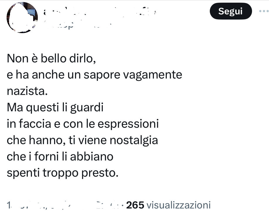 Discussione sugli ebrei assume presto toni violenti e triviali. Un’utente esprime il desiderio di prenderli a schiaffi, un altro – che definisce gli ebrei merd…- auspica che vengano colpiti con mazze ferrate per poi chiosare: «ti viene la nostalgia che i forni li abbiano spenti troppo presto».