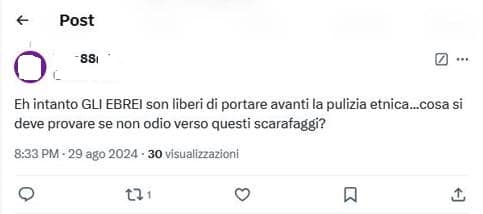 Utente X/Twitter che usa come nickname il numero 88 (in gergo neonazista corrisponde al saluto Heil Hitler) pubblica un commento che, prendendo spunto dal conflitto tra Hamas e lo Stato di Israele, incita all’odio contro gli ebrei e li paragona agli scarafaggi. La zoomorfizzazione è uno dei più arcaici e radicati stereotipi dell’immaginario antisemita.