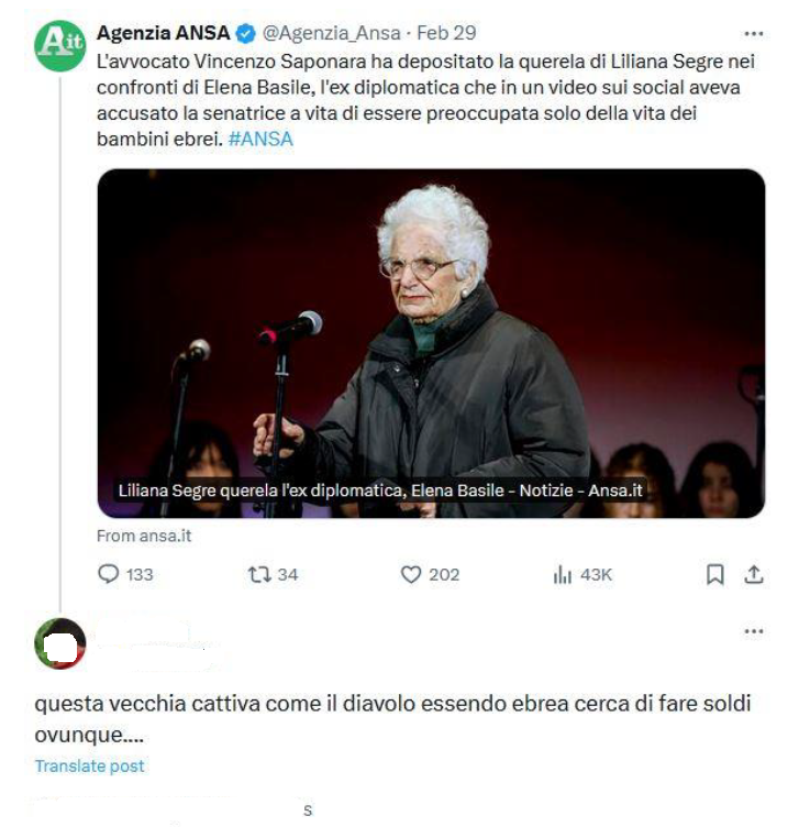 Utente X/Twitter commenta in chiave antisemita un articolo dell’agenzia ANSA su X (Twitter) dedicato alla senatrice Liliana Segre superstite della Shoah.