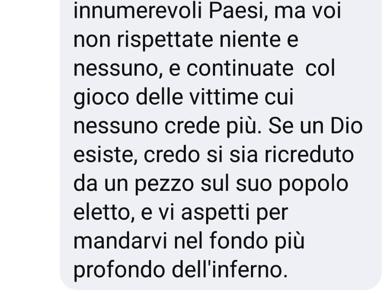 Utente X/Twitter invia ad un rabbino italiano un messaggio con contenuti antisemiti ispirato alla consegna da parte dei terroristi di Hamas dei corpi della famiglia Bibas e di altri ostaggi israeliani. Ecco la parte finale del post: «…voi non rispettate niente e nessuno, e continuate col gioco delle vittime cui nessuno crede più. Se un Dio esiste, credo si sia ricreduto da un pezzo sul suo popolo eletto, e vi aspetti per mandarvi nel fondo più profondo dell’inferno».