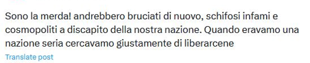 Utente X/Twitter commentando un post del Corriere della Sera che parla della canzone antisemita di Marcello De Angelis, scrive rivolgendosi agli ebrei: «sono la mer…! Andrebbero bruciati di nuovo, schifosi infami e cosmopoliti a discapito della nazione. Quando eravamo una nazione seria cercavamo giustamente di liberarcene».