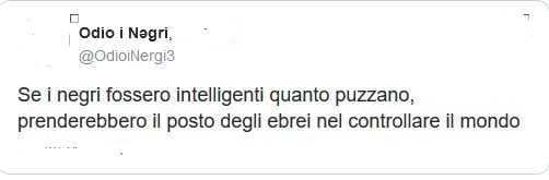 Utente X/Twitter che si fa chiamare “Odio i negri” posta il seguente commento razzista e antisemita: «Se i negri fossero intelligenti quanto puzzano, prenderebbero il posto degli ebrei nel controllare il mondo». I suoi followers rincarano la dose commentando in chiave compiaciutamente razzista questo post offensivo.