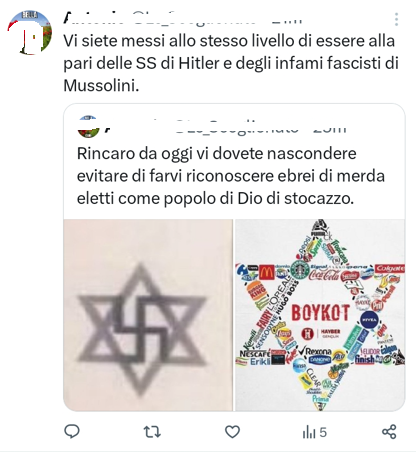 Utente X/Twitter posta commenti aggressivi e minacciosi contro gli ebrei: vi dovete nascondere evitare di farvi riconoscere ebrei di mer… eletti come popolo di Dio di stocaz… Paragona gli ebrei ai nazisti e rinverdisce antichi miti antisemiti come quello sulla presunta avidità ebraica.