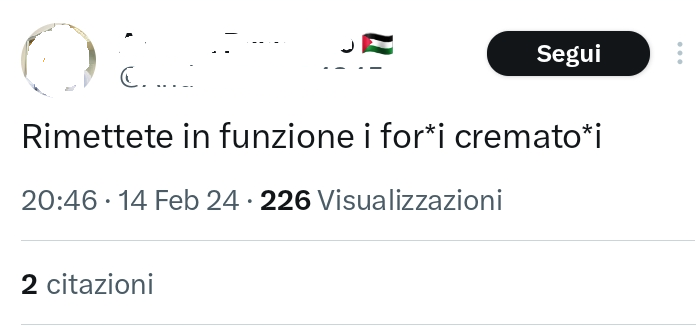 Utente X/Twitter pro pal posta un commento dove auspica la riaccensione dei forni crematori contro gli ebrei.