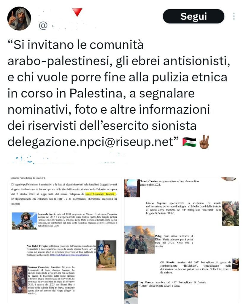 Influencer pro pal che – da anni – utilizza il suo profilo x per diffondere messaggi offensivi e minacciosi contro gli ebrei, pubblica un commento che riprende un articolo del (nuovo) Partico comunista italiano che invita a segnalare gli “agenti sionisti” in Italia.
