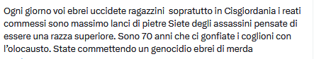 Stampa 30 Novembre 2023 X/Twitter, insulti antisemiti Fonte: Segnalazione CE « ebrei di mer…» Giornalista ebreo critica su X/Twitter la presa di posizione di una nota sostenitrice della causa palestinese, un altro utente chiosa in chiave antisemita.