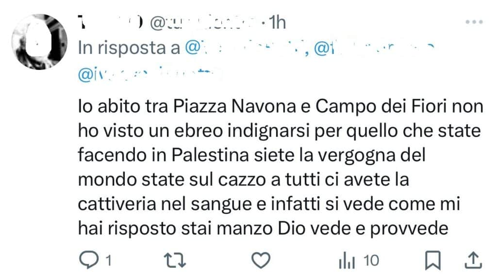 Utente X/Twitter posta volgari offese contro gli ebrei, tra le varie invettive anche l’accusa di deicidio («Gesù Cristo…siete stati voi ebrei a farlo fuori»).