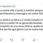 Utenti X/Twitter ebreo o ritenuti tali vengono insultati, di seguito un’antologia di invettive: «Hitler ha solo sbagliato secolo…2000 anni che vi schifano… La comunità ebraica spero diventi solo un brutto ricordo…feccia…menzogneri atavici…incarnazione della feccia…le differenze tra comunità ebraica e Hitler sono minime…ebrei o sionisti siete soltanto dei maledetti…siete dei criminali…gli ebrei sono fascisti…pezzi di mer…ipocrita merdac…».