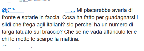 Mi piacerebbe averla di fronte e sptarle in faccia. Cosa ha fatto per guadagnarsi i sildi che frega agli italiani? slo perche’ ha un numero di targa tatuato sul braccio? Che se ne vada affanculo lei e chi le mette le scarpe la mattina.