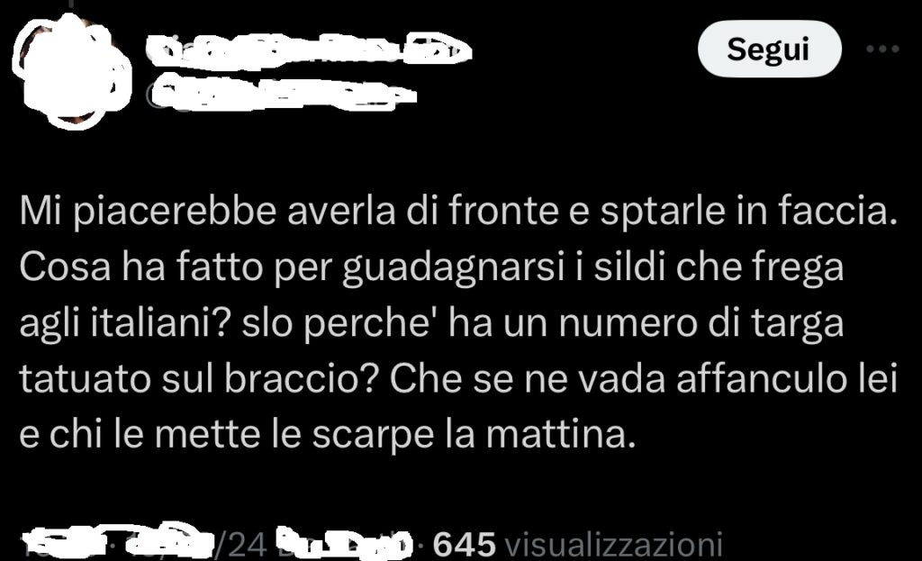 Utenti X/Twitter con varie formazioni ideologiche, ma tutti marcatamente pro pal, postano commenti di odio antisemiti, alcuni di quelli che augurano la morte ai “sionisti” usano come emoji simboli di pace ed “inclusivi”. Tra le vittime degli attacchi, oltre a generici ebrei stereotipizzati nel male, il giornalista Maurizio Molinari (obeso sionista) e la senatrice Liliana Segre insolentita in modo greve. Qui di seguito alcune frasi postate: E se togliessimo il diritto di parola a tutti quelli che sostengono uno stato nazista e genocida non sarebbe un mondo migliore?; non ti ricordi di Gesù mandato in croce dagli ebrei ; Comunque sti ebrei hanno veramente rotto il cazzo ; Faceva bene Hitler a bruciarli tutti…