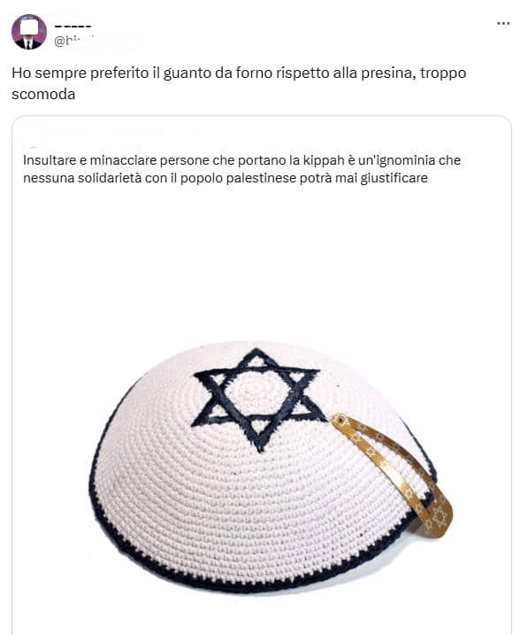 Pseudo-comico online con circa 3.600 persone che seguono i suoi post su X e specializzato nel farsi grevemente beffe degli ebrei, pubblica l’ennesimo insulto antisemita. Condivide il post («Insultare e minacciare persone che portano la kippah è un’ignominia che nessuna solidarietà con il popolo palestinese potrà mai giustificare») corredato da una kippah scritto da un noto giornalista per stigmatizzare un’aggressione antisemitica e lo commenta così: «Ho sempre preferito il guanto da forno rispetto alla presina, troppo scomoda».