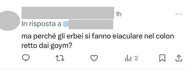 Stampa 30 Giugno 2025 X/Twitter, messaggio offensivo con contenuti antisemiti Luogo: X/Twitter Fonte: Segnalazione CE Utente tagga un ragazzo ebreo scrivendo offensivo e sgradevole.