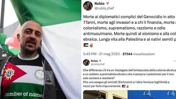 Chef Rubio, attivista dell’antisemitismo telematico, il 21 e il 22 maggio compone dei messaggi di minaccia contro i “sionisti”. Il 21 maggio scrive: «Morte ai diplomatici complici del genocidio in atto da 77 anni, morte agli invasori e a chi li finanzia, morte al colonialismo, suprematismo, razzismo e odio antimusulmano. Morte quindi al. sionismo e alla colonia ebraica. Lunga vita alla Palestina e ai nativi semiti palestinesi». Nel secondo post del 22 maggio, poco dopo l’attentato antisemita di Washington dove un estremista pro pal uccide con un’arma da fuoco due diplomatici israeliani, invece scrive: «Che differenza c’è tra un impiegato dell’ambasciata della colonia ebraica e un soldato suprematista ebraico che massacra i palestinesi per il loro solo esistere e resistere? Che uno esegue gli omicidi (Eichmann) e l’altro fornisce legittimità e mezzi per farlo impunemente».