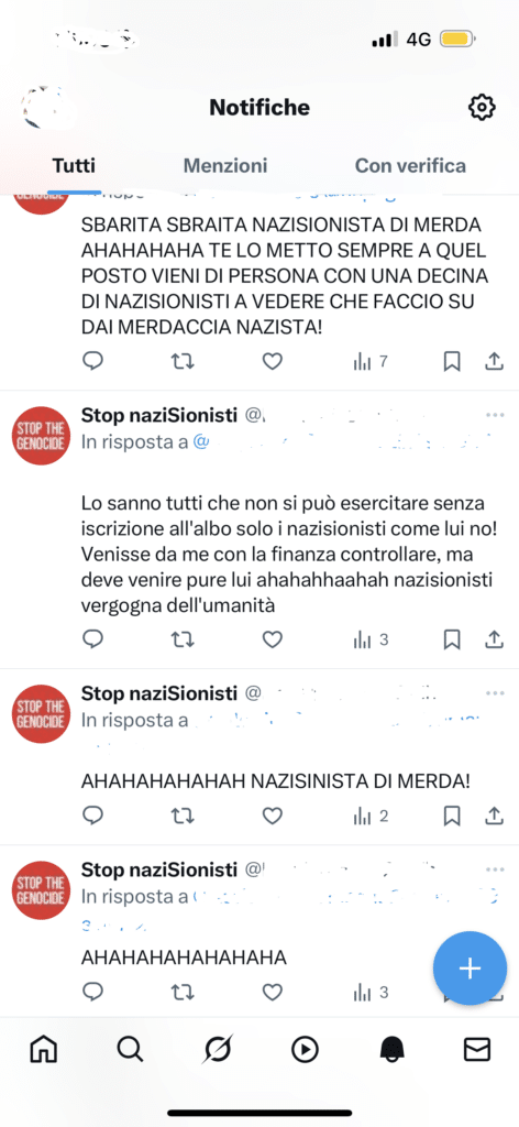 Account X “Stop naziSionisti” offende in modo triviale e minaccia un altro utente ebreo: «mer…nazisionista di mer..».