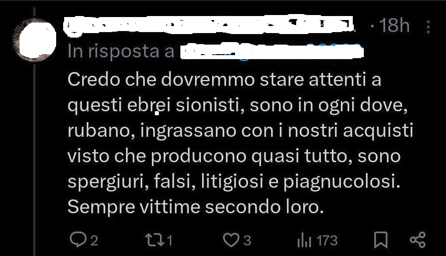 Utente X/Twitter pubblica un post antisemita che accusa gli ebrei sionisti: «sono in ogni dove, rubano, ingrassano con i nostri acquisti visto che producono quasi tutto, sono spergiuri, falsi, litigiosi e piagnucolosi. Sempre vittime secondo loro».