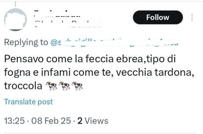 Stampa 8 Febbraio 2025 X/Twitter, post antisemita Fonte: Segnalazione «feccia ebrea» Utente X/Twitter posta volgari commenti antisemiti accompagnati da immagini da trivio.