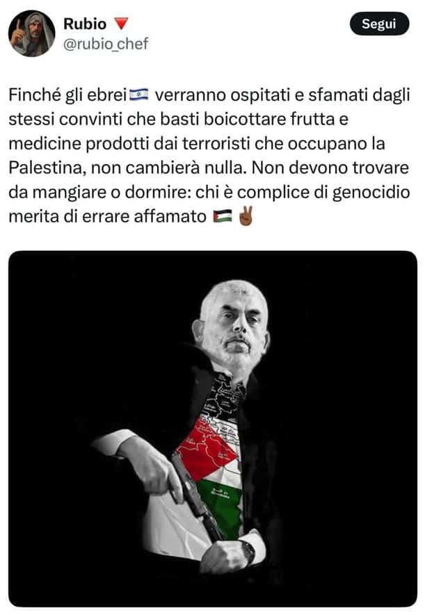 Chef Rubio, uno dei più attivi polemisti dell’antisemitismo in Italia, pubblica sul suo account X l’ennesimo post contro gli ebrei: «Finchè gli ebrei verranno ospitati e sfamati dagli stessi convinti che basti boicottare frutta e medicine prodotti dai terroristi che occupano la Palestina, non cambierà nulla. Non devono trovare da mangiare o dormire: chi è complice di genocidio merita di errare affamato». Il contenuto è accompagnato da un’ immagine del leader terrorista Sinwar mentre estrae un revolver.