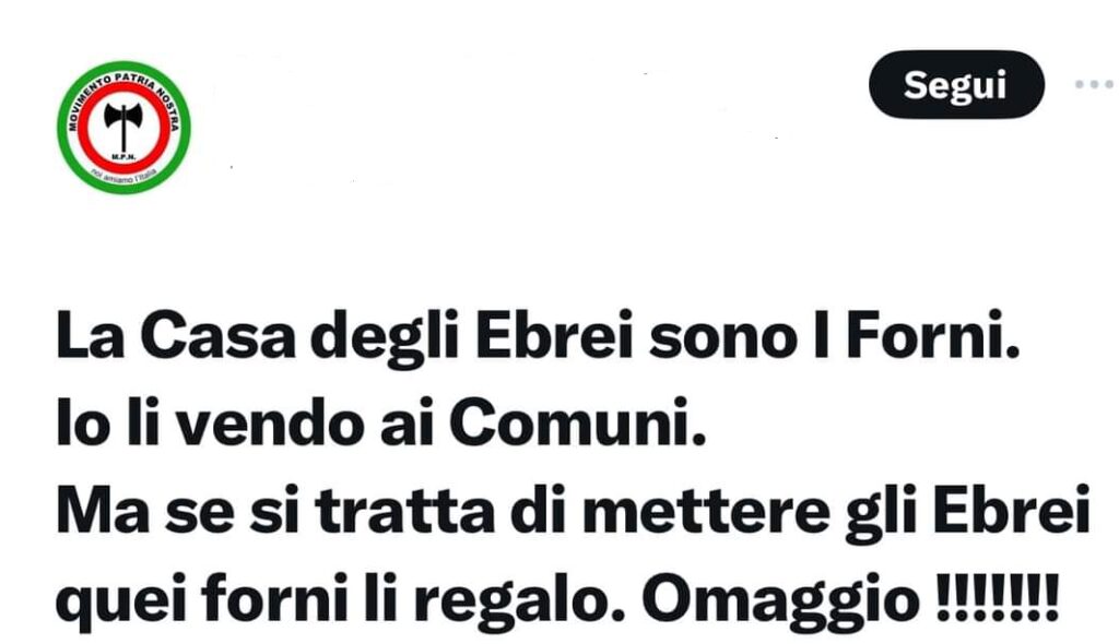 Simpatizzante di estrema destra posta un commento antisemita: «La casa degli ebrei sono i forni. Io li vendo ai comuni. Ma se si tratta di mettere gli ebrei quei forni li regalo. Omaggio !!!!!!»